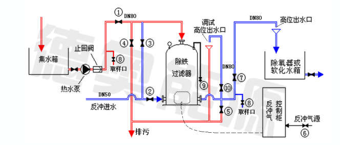 1、傳統(tǒng)的除鐵錳設(shè)備為保證濾料不板結(jié),大多要配置反沖洗水箱及大功率、大流量反沖泵,反洗用水量大,一般是過濾總量的5%,這一特性很不適合蒸汽鍋爐冷凝水的過濾。本系統(tǒng)采用獨(dú)家研制的氣水復(fù)合反沖洗系統(tǒng),僅用很少的能源和水量50噸就能達(dá)到反洗要求的膨脹率,將系統(tǒng)清洗干凈恢復(fù)正常工作。